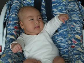 加拿大所有的孩子坐车都必须有 安全坐椅。坐椅分的很细,照片中的这个只能使用到孩子20磅。这个是一个朋友送的,在国外,没有父母在身边,朋友就显得更加重要。有了这个小坐椅,我们经常把它放在书桌旁边的小矮柜上。当我们在电脑前工作时,宝宝就坐在旁边看着我们。当我们面对电脑,她就手脚乱动,弄出很大的响声。转头看她,她会象做了错事,立刻停下,逗逗她,就会很开心的傻笑,知道你又注意她了。