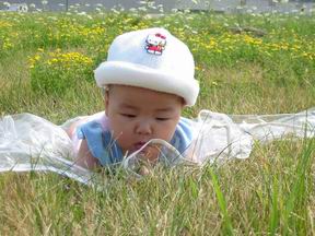 宝宝立志要作个小植物学家,于是,小小的她一早就趴在草地里,开始做起她的研究。