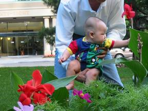 贪心的宝宝不满足只是观赏,还伸手去采,想要据为己有。全不管爸爸在一边大呼小叫,怕宝宝折坏了公园里的花花草草。