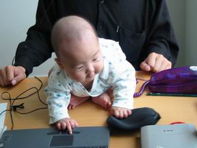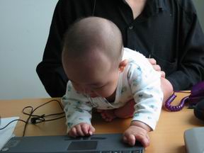 上了桌的宝宝可就不那么安耽了。她显示出了无穷的精力。她对桌上的一切可抓的东西都有兴趣。尤其是电话线,耳机线和鼠标等可以轻易抓住的东西。别看宝宝小,破坏力可不小,抓住耳机的线就用两只手猛烈撕扯,真担心她能把线扯断为止。