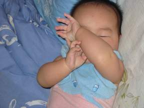 宝宝从出生没多久,躺在床上,两个小胳膊就总这样一摇一晃的,象拿着竹竿走钢丝的小运动员。小宝宝开始可还不知道这样的动作原来就是后来的要抱抱的意思,看来宝宝很有预见性,从那么小就开始练习了。