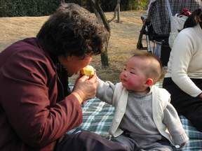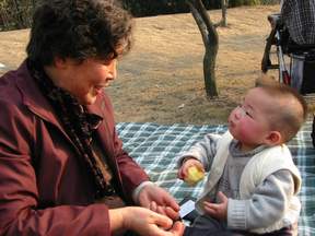 南方的天气尽管在冬天也总是暖暖的。11月了,还经常有很好的太阳。我们经常带着丫丫去奶奶家附近的小公园。铺上我们从加拿大带来的小垫子,丫丫就可以任意的在上面摸爬滚打。奶奶带来了苹果,给丫丫削了皮后,就整个给了她。因为我们经常让丫丫自己学习抓捏东西,尽管有时候弄的一片狼籍,也随她去。所以丫丫的手灵活性很好,这时候已经能够自己抓着东西往嘴里塞了。还吃的像模像样。