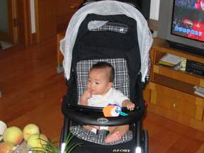 这是我们刚刚从加拿大回到中国不久拍摄的,这时候的丫丫还没有中文的小名,我们都还叫她小宝宝。5个多月的丫丫在小车的衬托下显得那么小,而且这时候的丫丫很乖,能安静的在她的小座椅中坐一会,可不象10个多月的现在,自己就能从小车里爬出来。丫丫爱嘬自己的手指头,而且还要一个一个换着啃,先大拇指,再食指,然后中指。看看光着脚丫嘬着手指头的丫丫看着那些水果的样子,多可爱呀。