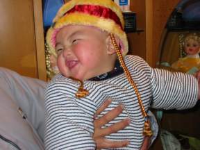 这可是丫丫最重要的怪脸之一,作得非常有难度,一般人可是学不象的呢!需要脸部所有肌肉的配合。首先眉头皱起,眼睛眯成一条线。然后鼻子同时皱起,小嘴张开,最重要的是还要露出丫丫最好看的两颗上门牙。说到丫丫这时候长的上下各两颗的门牙,不得不提一句,丫丫的牙齿也极有特色,上面两颗门牙挺大,之间的缝隙可以塞一个扁豆进去。下面呢,靠的紧紧的,挤来挤去的挤成了一个“八”字。很多人见了都安慰我,小时候牙齿难看,大了就好了,小时候整齐,大了反而糟了。要说到这个鬼脸是怎么来的,谁也不知道,直到忽然有一天,我发现怎么和丫丫的保姆的笑容很相似,保姆说她曾经带的小孩也有同样的鬼脸,才知道,原来这么“灿烂”的笑容,真的是出自保姆的手笔啊!
