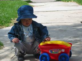 丫丫正在和新买的玩具--一个小拖车做不懈的斗争。