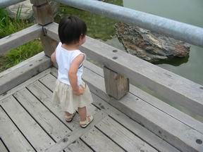 夏天,带着丫丫去对面的日本公园玩,丫丫最喜欢带上面包喂小鱼。池塘里还有乌龟和鸭子。鸭子通常最灵活,乌龟最迟缓,总是抢不到食。